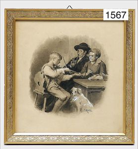 Bild, Maler E. RAVEL, Aquarell, ca. 1910, 25,5 cm x 26,5 cm, gerahmt, Motiv: Kinder mit Geige, Hund und Großeltern