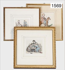 3 Bilder, Radierungen, Brükner, H.: Orig.-Radierung im zeitgenössischen Handkolorit, 1874, Darstellung: Kind mit Spielzeug, 12 cm x 12 cm, Junge auf Schaukelpferd, 8,5 cm x 10,5 cm, Geschwister, 11 cm x 12,5 cm, Mutter mit Geschwisterpaar beim Spiel, gerahmt im Passepartout