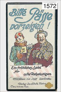 Spiel, "Bitte Pässe vorzeigen!, Ein fröhliches Spiel für alle Reiselustigen", Verlag Jos. Scholz, Mainz, mit Anleitung, im Orig.-Kart.