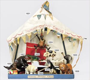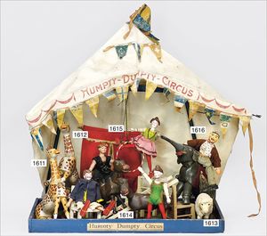 SCHOENHUT Humpty Dumpty, Zirkuszelt mit Manege, 68 cm hoch, 80 cm breit, 46 cm tief, mit Orig.-Fahnen, dazu 3 Stühle, 2 Leitern, Stoff altersbed. verschmutzt und zerschlissen, schöner unberührter Orig.-Zust.