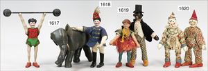 SCHOENHUT Humpty Dumpty, große Serie, 2 Teile, 1 x Gewichtheber mit Gewicht, Holz gegliedert, Porzellankopf, Filzhut und Jacke, Stoffhose, 21 cm, 1 Elefant, Holz gegliedert, Lederohren, Kunststoff-Stoßzähne, Glasaugen, guter Zust.