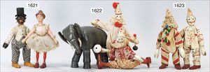 SCHOENHUT Humpty Dumpty, große Serie, Konv. 3 Teile, 1 x Clown, Holz gegliedert, 27 cm, anmodellierte Lederohren, Holzhut, 1 x Clown, 23 cm, Stoffkleidung, anmodellierte Lederohren, Stoffhut, 1 Fuss abgebrochen, dazu 1 Elefant, 14 cm, Lederohren, Glasaugen, Gummi-Stoßzähne, altersbed. Farbverlust