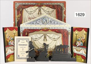 Schattentheater, mit bewegl. Figuren, bunt lithogr. Kulisse, zum Aufklappen, 48 cm breit, 33 cm hoch, mit Textbuch, Orig.-Kart., Deckbild bunt lithogr., Seitenlaschen am Kart.-Deckel fehlen, insgesamt schöner Orig.-Zust., um 1900