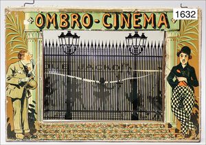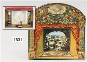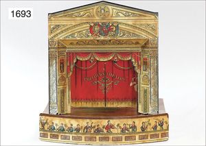 Theater, Ombro-Cinema, transparente Kulisse mit dahinter sich bewegenden Bildern, Kurbelantrieb, Korpus mit lithogr. Papier beklebt, 43 cm breit, 30 cm hoch, Einrissstellen in der Kulisse, ca. 1920
