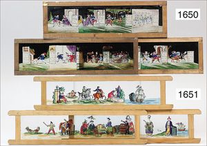 Konv. Glasbilder, für Laterna Magica, ca. 50 Teile, meist 26 cm x 6,5 cm, meist guter Zust., ein paar beschädigt, dazu 1 Farbenrad