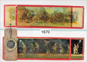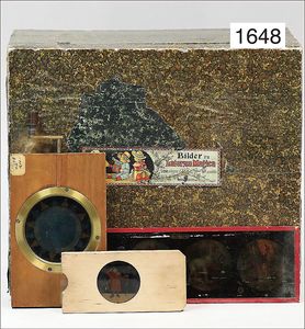 Bilder zu Laterna Magica, Orig.-Kart. gefüllt mit großformatigen ausgef. Glasbildern, 24 cm x 6,2 cm, 24 cm x 8,5 cm, 3 bewegliche Bilder, Leuchter mit Farbenrad, 18 cm x 11 cm, mit Kurbelantrieb, ausgef.