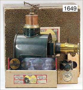 BING Laterna Magica, Blech, auf Holzsockel, 22,5 cm hoch, Orig.-Schornstein, Linse, Brenner, Glas, Glas an Brenner gesprungen, mit Bildsatz, 12-teilig, im Orig.-Kart., Kart. mit bunt lithogr. Deckbild