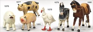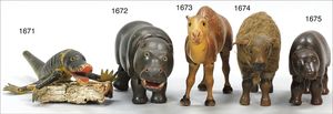 HUMPTY DUMPTY 1 Esel, Lederohren, Glasaugen, 15 cm hoch, 24 cm lang, 1 Elefant, 16 cm hoch, 22 cm lang, 1 Clown, aufgelegtes Gesicht, Holz-Kopf und -Körper, 21 cm hoch