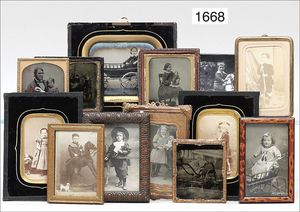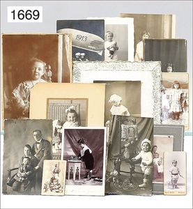 17 gerahmte Bilder, sowie Glasbilder (Negative), meist Kinder mit Spielzeug, untersch. Größen, 8,5 cm - 13 cm, schönes Konv.