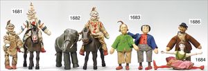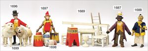 SCHOENHUT Humpty Dumpty, große Serie, 2 Esel, Holz gegliedert, 17 cm stehend, Lederohren bespielt, farbl. ein wenig ausgebessert, dazu Dompteur, Porzellankopf, 21 cm, Stoffkleidung, 1 x Akrobatin, Porzellankopf, 20 cm, mit Filzanzug, 1 Reifen, schönes Konv.