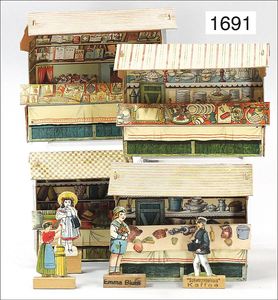 Jahrmarkt, Menagerie, Pappe lithogr., Verkaufsbuden, Figuren, mit bunt lithogr. Papier beklebt, im Orig.-Kart., schönes Deckbild, ca. 1890, Frankreich