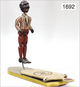 SCHOENHUT Humpty Dumpty, große Serie, Konv. 2 Teile, 1 x Akrobatin, Holz gegliedert, 21 cm, ein wenig bespielt, Stoffkleidung mit Pailletten bestickt, 1 x dunkelhäutiger Dompteur, 23 cm, anmodellierte Lederohren, Stoffkleidung, Zylinder, guter Zust.