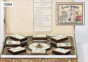 Spiel, Frankreich, Engel Gabriel, Jeu de bonne Avuenture, Wahrsagespiel über Glück und Liebe, schön lithogr. Orig.-Kart., 27 x 22 x 5,5 cm, vor 1900, mit Anleitung, innen 8 bunt lithogr. Schachteln die mit kl. Zettelchen gefüllt sind, auf denen Fragen zu beantworten sind, die sich ergeben durch Drehen des mittleren Kreises