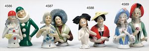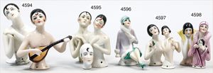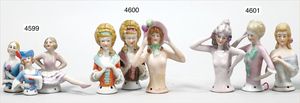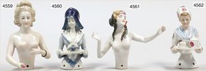 3 Porzellan-Halbpuppen, glasiertes Porzellan, 1 x Tänzerin, gemarkt 7144, 6 cm, 1 x gemarkt 5176, 6 cm, 1 x modellierter Hut, 5 cm
