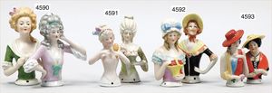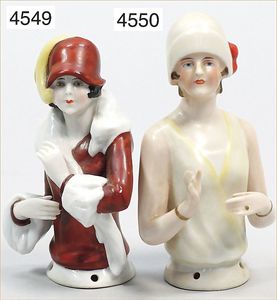 2 Porzellan-Halbpuppen, glasiertes Porzellan mit schön modellierten Hüten, Stoff bezogen, Porzellan-Beine mit goldenen Schuhen, Höhe je 12 cm