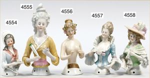 2 Porzellan-Halbpuppen, glasiertes Porzellan, 1 x gemarkt 14344, mit schön ausmodellierter Haube, 10 cm, 1 x gemarkt Germany 8031, mit Hut und Fächer, 10 cm