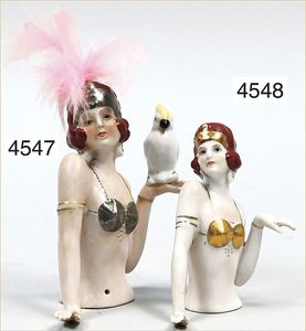 Porzellan-Halbpuppe, glasiertes Porzellan, mit schön modellierter Frisur, Art Deco, mit angeklebter Feder und aufmodelliertem Papagei, 12 cm