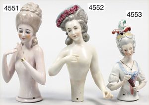 2 Porzellan-Halbpuppen, glasiertes Porzellan, mit schön ausmodellierter Frisur, 1 x 13 cm, 1 x Porzellan-Beine, goldene Schuhe, etwas Farbabrieb, 12 cm