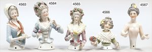 DRESSEL, KISTER & CO. Porzellan-Halbpuppe, glasiertes Porzellan, mit schön modellierter Frisur, mit Schleife, Blumenstrauß haltend, 9,5 cm