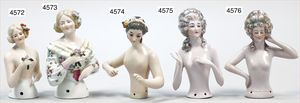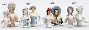 2 Porzellan-Halbpuppen, glasiertes Porzellan, 1 x gemarkt Dep. 13418 Germany, modellierte Frisur mit Schleife und Blütenkorb, 10 cm, 1 x gemarkt Dep. 13942, modellierte Frisur mit Federschmuck und Spiegel haltend, 9 cm