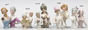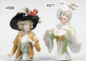 2 Porzellan-Halbpuppen, glasiertes Porzellan, 1 x gemarkt Germany, mit modelliertem Hut und Kette, re. Schulter geklebt und überstrichen, 7,5 cm, 1 x mit Hut und Ohrringen, 9 cm
