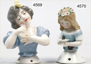 2 Porzellan-Halbpuppen, glasiertes Porzellan mit schön modellierter Frisur, 1 x mit Rosenblüte haltend, Stoff bezogen, 14 cm und 16 cm