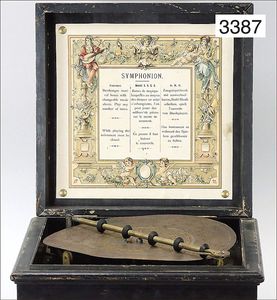 Symphonion, Holz, aufgamaltes Dekor, etwas abgerieben, 30 cm x 30 cm, 18 cm hoch, Uhrwerk intakt, 1 Lochplatte, ca. 1890
