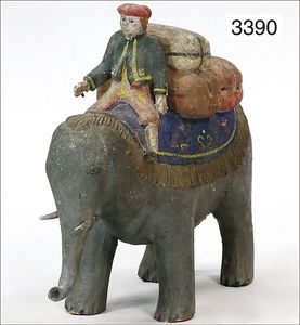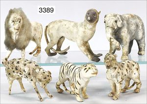 Biedermeier, 6 Masse-Tiere, Leder bezogen, für Zirkus-Szene, Glasaugen, teilweise guter Zust., teilw. altersbedingte Fehler, Affe, Tiger, Löwe, Elefant, Gepard, 13 cm lang, 10 cm hoch