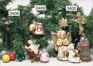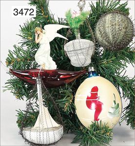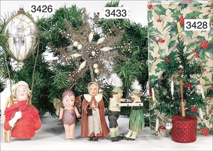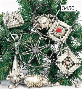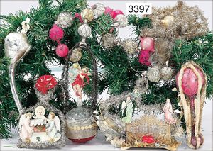 Konv. Christbaumschmuck, Mustervorlagen für Christbaumschmuck, Glocke, Reflexe, Zapfen, Wachs mit buntem Silberpapier überzogen, dazu 1 Wachs-Christkind in Krippe