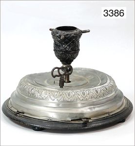 Christbaumständer, mit Musikspielwerk, Uhrwerk intakt, 2 untersch. Melodien, umschaltbar, Durchm. 36 cm, Holzsockel Spannungsriss, Metallabdeckung mit Druckstellen, kl. Fehlstelle am Rand, ausgefallen