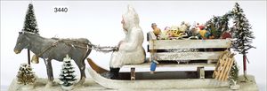 Weihnachtsmann auf Rentier, Weihnachtsmann mit ausdrucksstarkem Biskuit-Gesicht, mit Watte und Kreppkleidung auf Mohair-Rentier, Hörner fehlen, Gesamthöhe 43 cm, 34 cm lang, ausdrucksstark