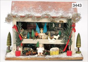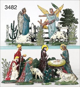 Blei-Krippe, farbig gefasst, leichter Farbverlust, Jesus, Maria, Josef, 3 Könige, 2 Engel, 4 Schafe, Baum, Büsche, Kakteen