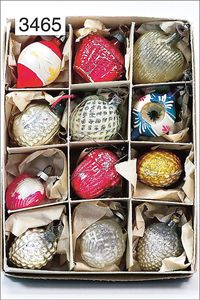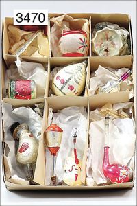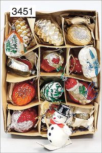 13 Teile Christbaumkugeln, Spiegelglas, versch. Motive, 4 cm bis 8 cm, darunter 1 Milchglas Fliegepilz und 1 Watteschneemann auf Ski, mit Zylinder, 60er Jahre