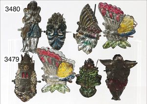 7 Kerzenhalter, Zwicker, Blech lithogr., mit Engel und Blumendekor, Ende des 19. Jahrhunderts, Gebrauchsspuren