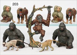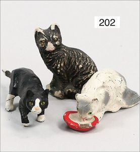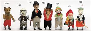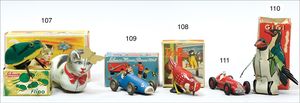 KÖHLER-Katze mit Schmetterling, Blech lithogr., Uhrwerk intakt, Vorderbeine und Schwanz fehlen, im Orig.-Kart., dazu SCHUCO Flipo, Frosch, 930, guter Zust., im Orig.-Kart.