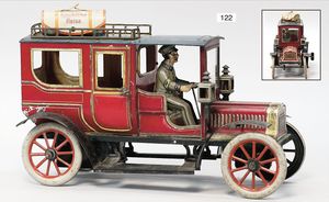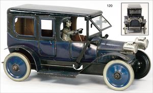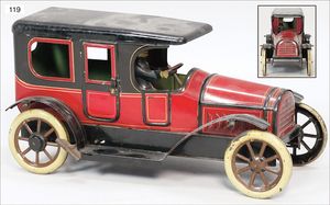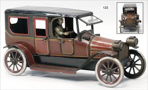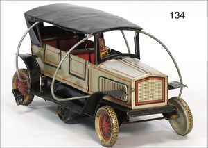 CARETTE gr. Landaulette, Blech lithogr., 31 cm, mit Fahrerfigur, 2 Türen zum Öffnen, ca. 1915, 1 Gepäckstück, Uhrwerk intakt, guter Zust., mit kl. Spielspuren