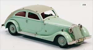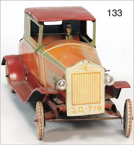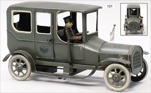 DISTLER Limousine, gemarkt J. D. 718, Blech lithogr., 24 cm, Uhrwerk intakt, mit Fahrerfigur, elektr. beleuchtete Frontscheinwerfer