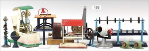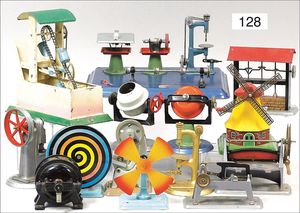 Konv. Dampfmaschinen-Antriebsteile, Schöpfrad, Stanze, Klopfwerk, Windmühle, Bohrer, Betonmischmaschine, Säge, teils DOLL, teils FLEISCHMANN, teils WILESCO, bespielt, meist gut
