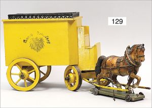 Postkutsche, Holz, Aufschrift: "Deutsche Reichspost", mit Masse-Pferd, Länge 20 cm, auf Rädern Aufschrift: LINEOL, altersbed. Rissbildung, Gesamtlänge 60 cm