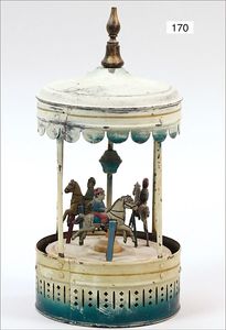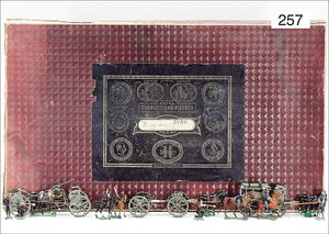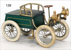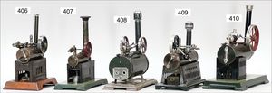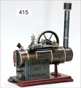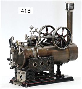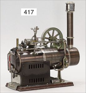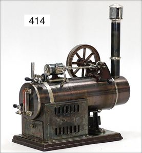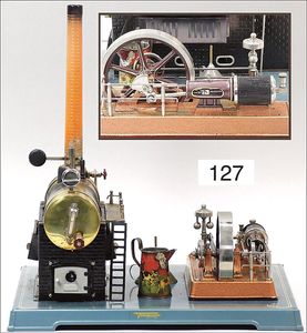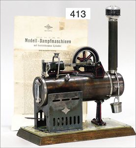 473/1, ca. 1912, kl. stationäres Lokomobil, Grundplatte 17 x 10,5 cm, Kesseldurchm. 5 cm, Messing brüniert, Schornstein, Pfeife, Brenner, bespielt., guter Zust., Lackfehler a. d. Bodenplatte