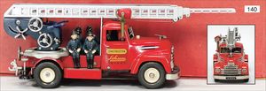 SCHUCO Constructions-Feuerwehr, gemarkt M6060, Blech, 29 cm, mit 5 Masse-Feuerwehrmännern, Drehleiter, Lichter, batteriebetriebene Lenkung, im Orig.-Kart., sehr gut