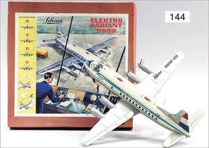JOUSTRA Oberleitungsbus, Frankreich, 29 cm, Blech lithogr., 2 Türen zum Öffnen, 3-Achser, Fuhrwerk dreht durch, elektr. beleuchtete Frontscheinwerfer, 1 Lampe fehlt, bespielt, gut