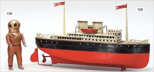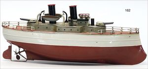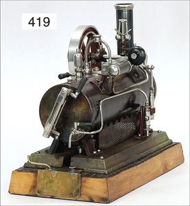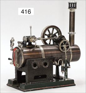 DOLL gr. liegende Dampfmaschine, Kesseldurchm. 9 cm, Grundplatte 36 cm x 36 cm, Wasserstandsglas, Manometer, Pfeife, Fliehkraftregler, Speisepumpe, Schornstein und Brenner, starke Lackfehler an der Bodenplatte, sonst insgesamt guter Zust., techn. nicht geprüft, Orig.-Holzkiste, Dachbodenfund
