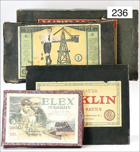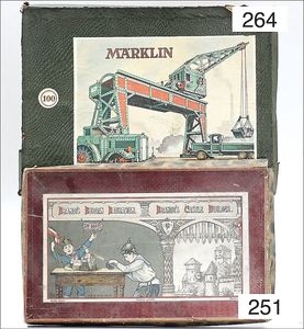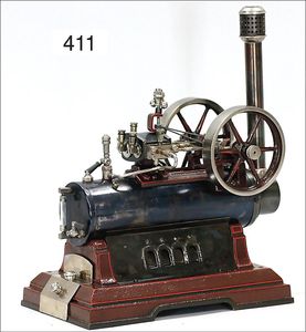 MÄRKLIN 4112/1, ca. 1905, stehende Dampfmaschine, 34 cm hoch, Grundplatte 25,5 cm x 16,5 cm, Kesseldurchm. 9 cm, Wasserstandsglas, Pfeife, Fliehkraftregler, Speisepumpe, Orig.-Brenner, Schornstein, Durchm. Schwungrad 10 cm, Bodenplatte mit aufgemaltem Kachelmuster, kl. Druckstelle am Kessel, altes MÄRKLIN-Zeichen, kl. Lackfehler an der Bodenplatte