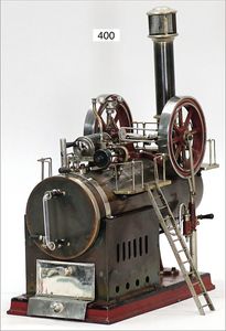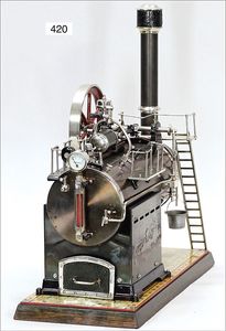 DOLL 320/5, ca. 1934, gr. stehende Dampfmaschine, 41 cm hoch, Kesseldurchm. 8 cm, Messing brüniert, Sockel Guss, Wasserstandsglas, Pfeife, Manometer, mit Schornstein und Brenner, guter Zust.