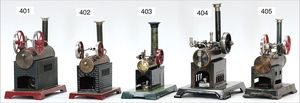 BING 8010, ca. 1902, stehende Dampfmaschine, 33 cm hoch, Kesseldurchm. 8 cm, Messing brüniert, Sockel möglicherweise 1 x übermalt, Wasserstandsglas, Pfeife, Schwungraddurchm. 10,5 cm, Orig.-Brenner und Schornstein, guter Zust., kl. Druckstellen am Schornstein