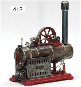 PLANK 218/1, ca. 1914, stationäres Lokomobil, 29 cm, Kesseldurchm. 8,5 cm, Messing brüniert, mit aufgemalten Zierstreifen, Schornstein, Pfeife, Fliehkraftregler, Wasserstandsglas, Brenner, Sockel, Guss lackiert, Durchm. Schwungrad 11,5 cm, mit Schild UNION, guter Zust.