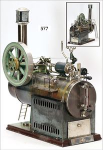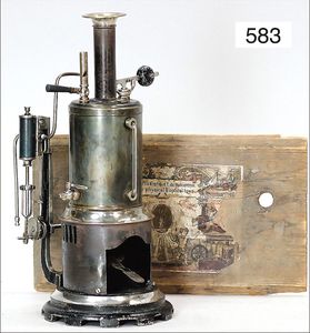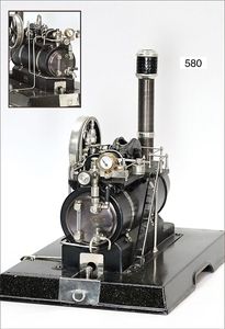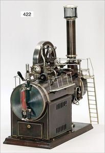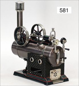 CARETTE 691/4P, ca. 1910, stationäres Lokomobil, Kesseldurchm. 8 cm, Messing brüniert, Schwungrad Durchm. 9 cm, Pfeife, Schornstein, Fliehkraftregler, Manometer, Wasserstandsglas, Speisepumpe, Brenner, Sockel Guss lackiert, leicht bespielt., guter Zust.