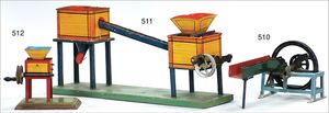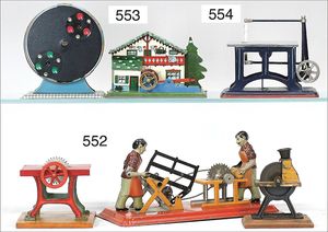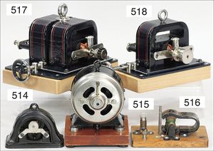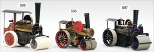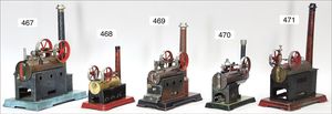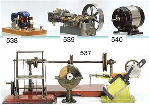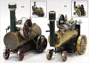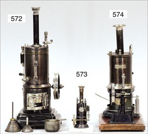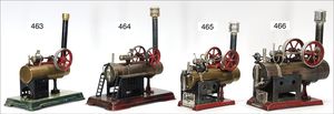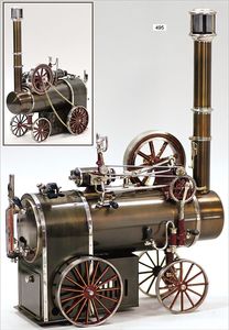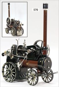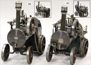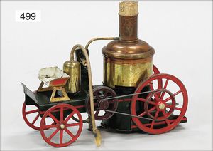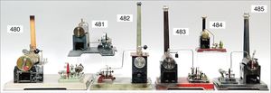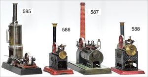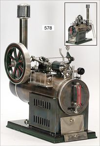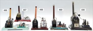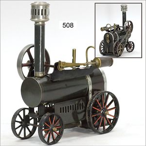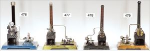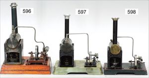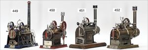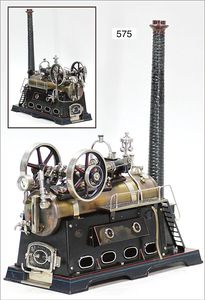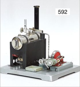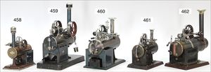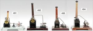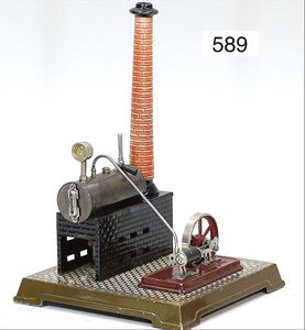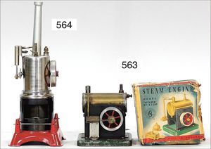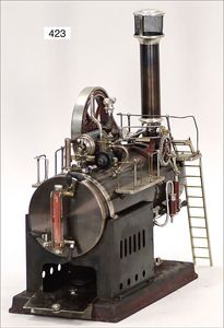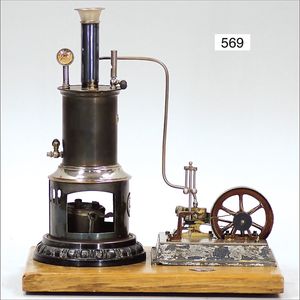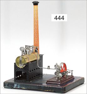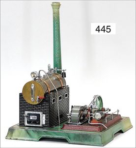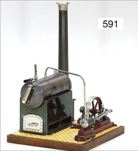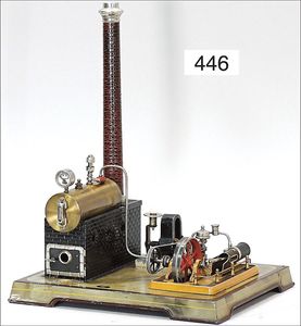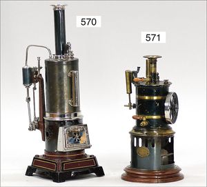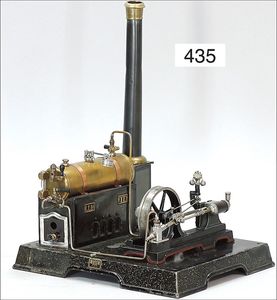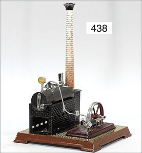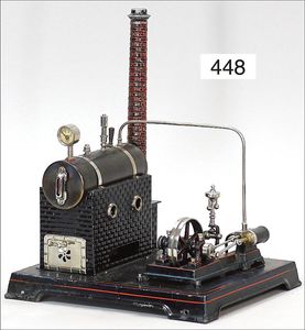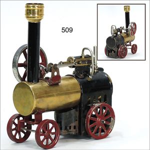 DOLL 512/1, ca. 1927, stationäres Lokomobil, 28,5 cm, Kesseldurchm. 7 cm, Messing brüniert, Speisepumpe, Wasserstandsglas, Brenner, 1 Haltelasche am Schornstein fehlt, Maschine farbl. überarbeitet, optisch in sehr gutem Zust.