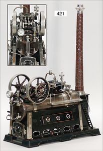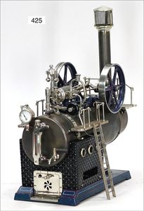 DOLL 510/5, ca. 1923, großes stationäres Lokomobil, 36 cm, Kesseldurchm. 11 cm, Messing brüniert, Schornstein, Fliehkraftregler, Wasserstandsglas, Brenner, Speisepumpe, Treppe, Sockel, Guss lackiert, altersbed. Lackfehler am Gehäuse, sowie am Sockel, stattliche Größe